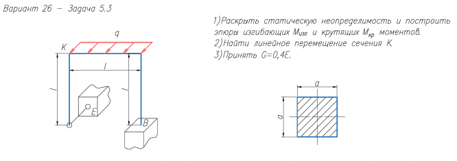 1)Раскрыть статическую неопределимость и построить эпюры изгибающих M/изг и крутящих M/кр моментов. 2)Найти линейное перемещение сечения К. 3)Принять G=0,4E.