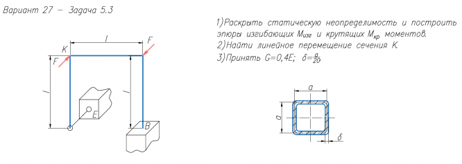1)Раскрыть статическую неопределимость и построить эпюры изгибающих M/изг и крутящих M/кр моментов. 2)Найти линейное перемещение сечения К. 3)Принять G=0,4E.