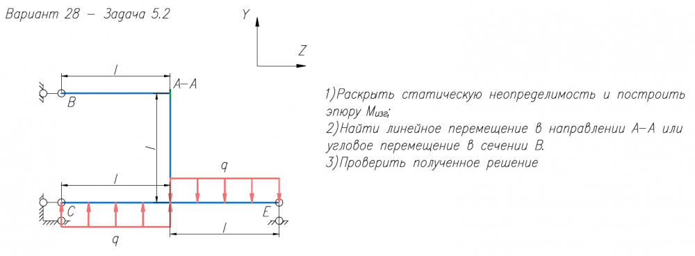1)Раскрыть статическую неопределимость и построить эпюру M/изг; 2)Найти линейное перемещение в направлении А-А или угловое перемещение в сечении В. 3)Проверить полученное решение.