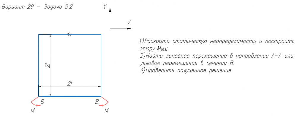 1)Раскрыть статическую неопределимость и построить эпюру M/изг; 2)Найти линейное перемещение в направлении А-А или угловое перемещение в сечении В. 3)Проверить полученное решение.