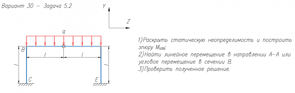 1)Раскрыть статическую неопределимость и построить эпюру M/изг; 2)Найти линейное перемещение в направлении А-А или угловое перемещение в сечении В. 3)Проверить полученное решение.