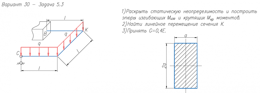 1)Раскрыть статическую неопределимость и построить эпюры изгибающих M/изг и крутящих M/кр моментов. 2)Найти линейное перемещение сечения К. 3)Принять G=0,4E.