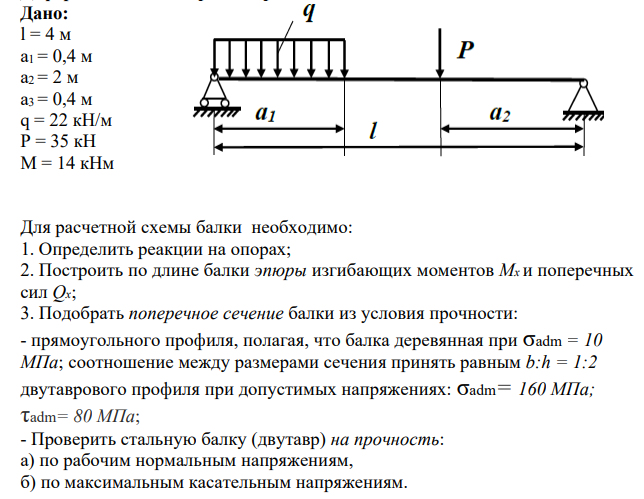 Для расчетной схемы балки необходимо: 1. Определить реакции на опорах; 2. Построить по длине балки эпюры изгибающих моментов Мx и поперечных сил Qx; 3. Подобрать поперечное сечение балки из условия прочности: - прямоугольного профиля, полагая, что балка деревянная при σadm = 10 МПа; соотношение между размерами сечения принять равным b:h = 1:2 двутаврового профиля при допустимых напряжениях: σadm= 160 МПа; τadm= 80 МПа; - Проверить стальную балку (двутавр) на прочность: а) по рабочим нормальным напряжениям, б) по максимальным касательным напряжениям.