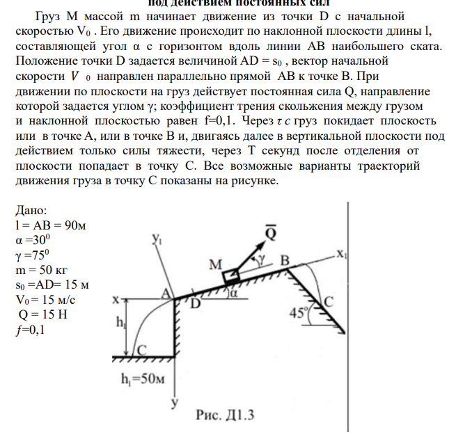 Груз М массой m начинает движение из точки D с начальной скоростью V0 . Его движение происходит по наклонной плоскости длины l, составляющей угол α с горизонтом вдоль линии АВ наибольшего ската. Положение точки D задается величиной AD = s0 , вектор начальной скорости 𝑉 0 направлен параллельно прямой АВ к точке В. При движении по плоскости на груз действует постоянная сила Q, направление которой задается углом γ; коэффициент трения скольжения между грузом и наклонной плоскостью равен f=0,1. Через τ с груз покидает плоскость или в точке A, или в точке B и, двигаясь далее в вертикальной плоскости под действием только силы тяжести, через T секунд после отделения от плоскости попадает в точку С. Все возможные варианты траекторий движения груза в точку C показаны на рисунке.