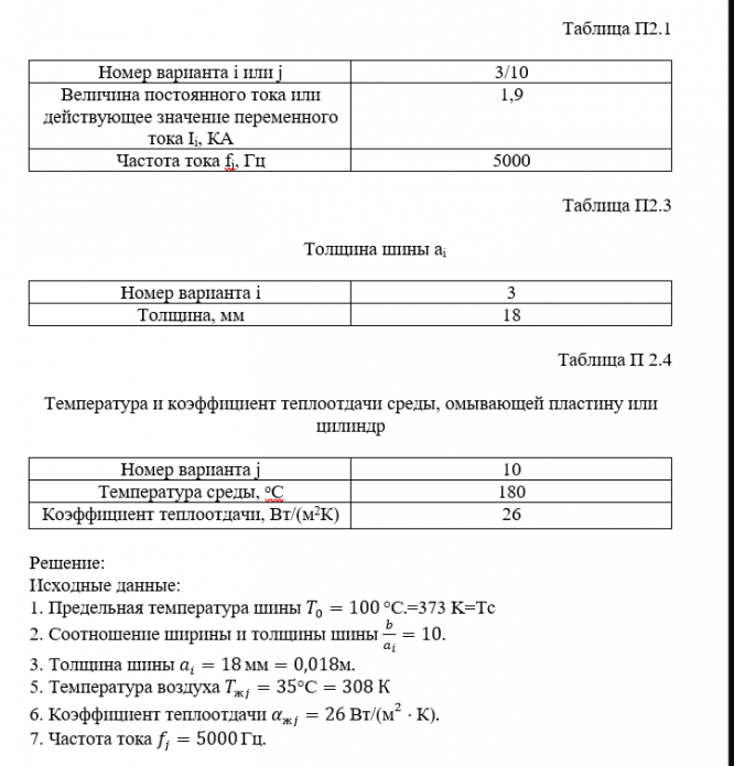 Участок электрической цепи выполнен из прямоугольной шины. Предельно допустимая температура шины Т0 = 100 оС. Соотношение ширины и толщины шины . Шина находится в воздухе с температурой Тжj, значение ширины шины аi выбирается по табл. П2.3, а температура воздуха Тжj и коэффициент теплоотдачи aжj – по табл. П 2.4.