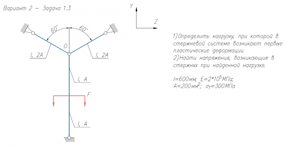 1)Определить нагрузку, при которой в стержневой системе возникают первые пластические деформации. 2)Найти напряжения, возникающие в стержнях при найденной нагрузке. l=600мм; E=2*105/МПа; A=200мм2/; σ/Т=300МПа .