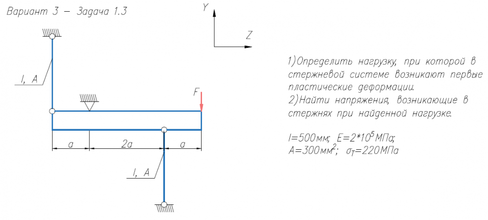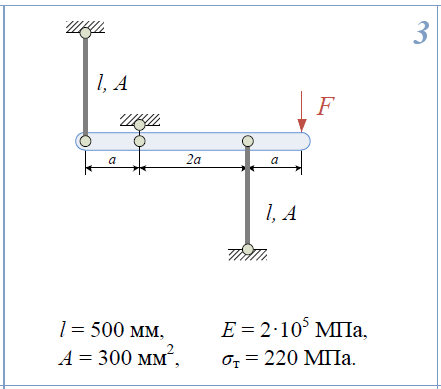 1)Определить нагрузку, при которой в стержневой системе возникают первые пластические деформации. 2)Найти напряжения, возникающие в стержнях при найденной нагрузке. l=500мм; E=2*105/МПа; A=300мм2/; σ/Т=220МПа.