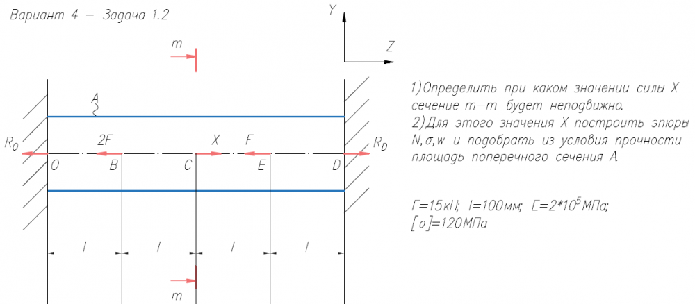 1)Определить при каком значении силы X сечение m-m будет неподвижно. 2)Для этого значения Х построить эпюры N,σ,w и подобрать из условия прочности площадь поперечного сечения А. F=15кН; l=100мм; E=2*105/МПа; [σ]=120МПа.
