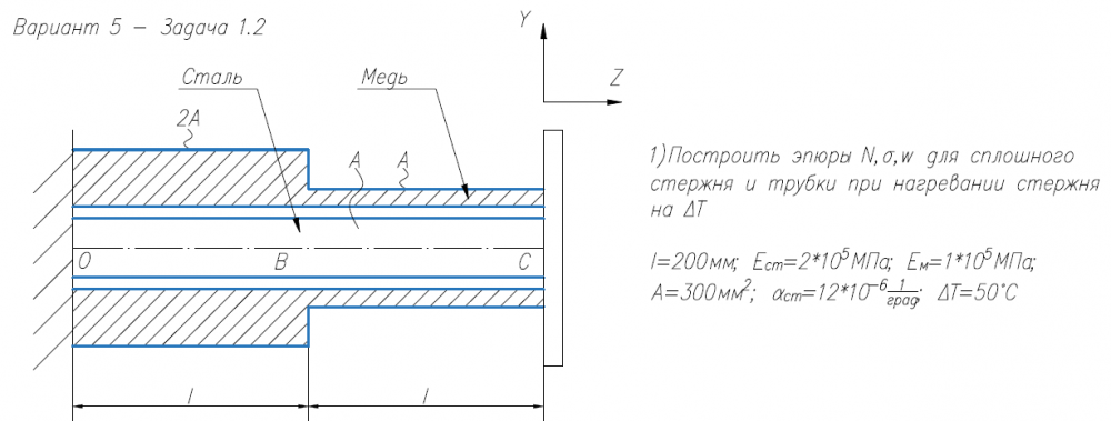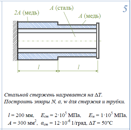 1)Построить эпюры N,σ,w для сплошного стержня и трубки при нагревании стержня на ΔT l=200мм; E/ст=2*105/МПа; E/м=1*105/МПа; A=300мм2/; α/ст=12*10-6/1/град; ΔT=50°С .