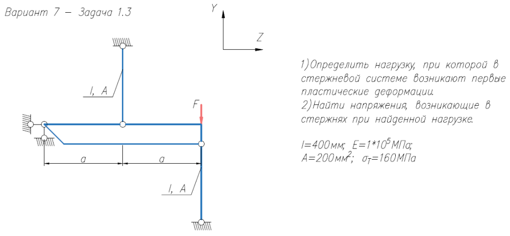 1)Определить нагрузку, при которой в стержневой системе возникают первые пластические деформации. 2)Найти напряжения, возникающие в стержнях при найденной нагрузке. l=400мм; E=1*105/МПа; A=200мм2/; σ/Т=160МПа .