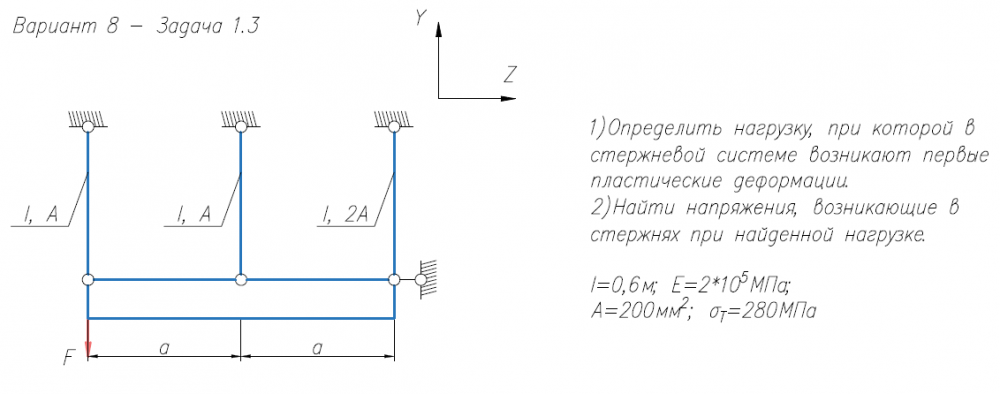 1)Определить нагрузку, при которой в стержневой системе возникают первые пластические деформации. 2)Найти напряжения, возникающие в стержнях при найденной нагрузке. l=0,6м; E=2*105/МПа; A=200мм2/; σ/Т=280МПа.