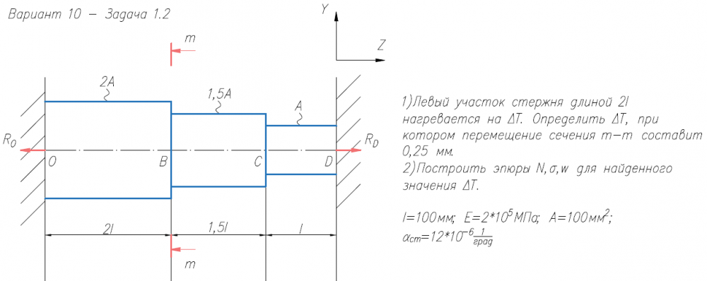 1)Левый участок стержня длиной 2l нагревается на ΔT. Определить ΔT, при котором перемещение сечения m-m составит 0,25 мм. 2)Построить эпюры N,σ,w для найденного значения ΔT. l=100мм; E=2*105/МПа; A=100мм2/; α/ст=12*10-6/1/град.