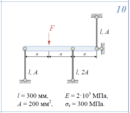 1)Определить нагрузку, при которой в стержневой системе возникают первые пластические деформации. 2)Найти напряжения, возникающие в стержнях при найденной нагрузке. l=300мм; E=2*105/МПа; A=200мм2/; σ/Т=300МПа .