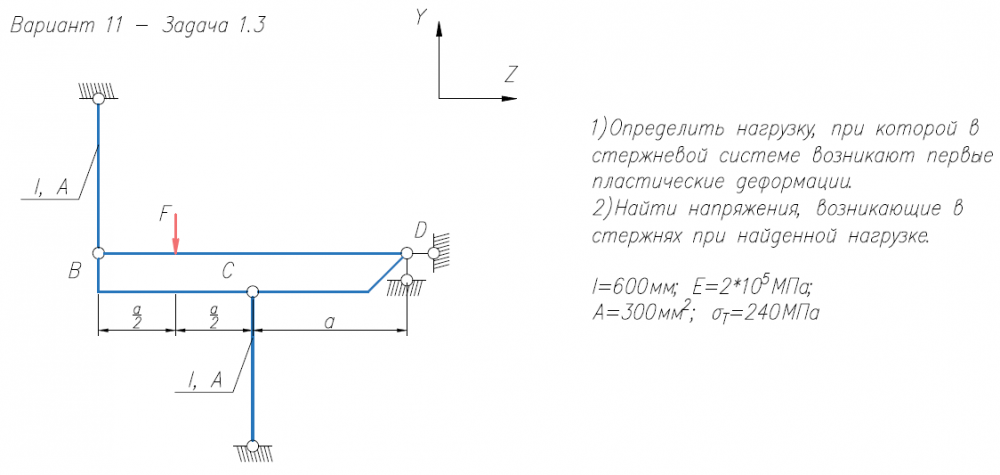 1)Определить нагрузку, при которой в стержневой системе возникают первые пластические деформации. 2)Найти напряжения, возникающие в стержнях при найденной нагрузке. l=600мм; E=2*105/МПа; A=300мм2/; σ/Т=240МПа .