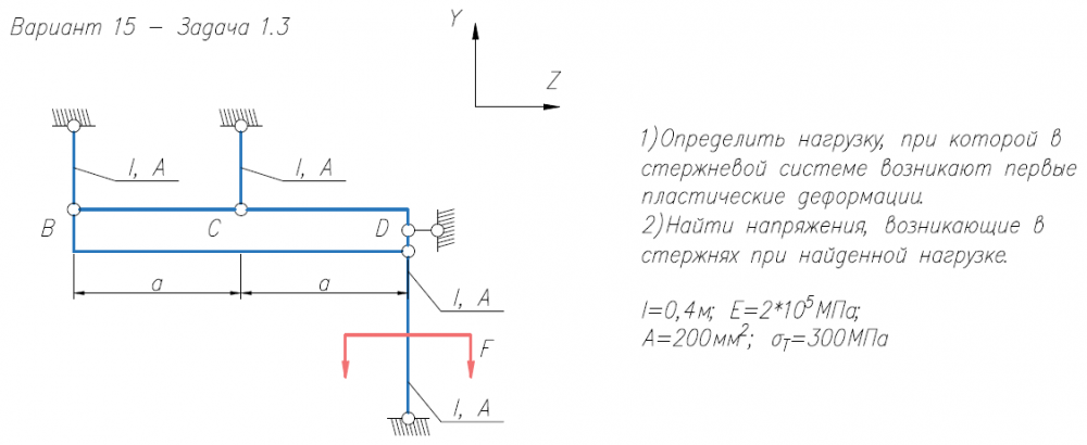1)Определить нагрузку, при которой в стержневой системе возникают первые пластические деформации. 2)Найти напряжения, возникающие в стержнях при найденной нагрузке. l=0,4м; E=2*105/МПа; A=200мм2/; σ/Т=300МПа.