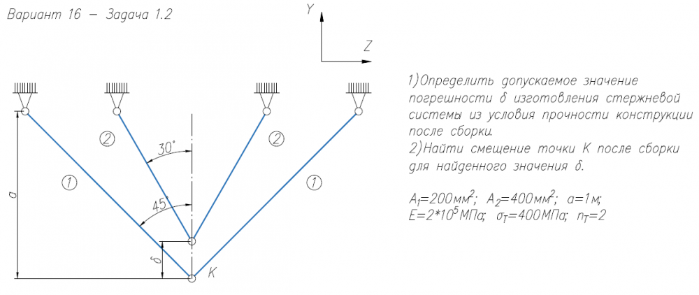 1)Определить допускаемое значение погрешности δ изготовления стержневой системы из условия прочности конструкции после сборки. 2)Найти смещение точки К после сборки для найденного значения δ. A/1=200мм2/; A/2=400мм2/; a=1м; E=2*105/МПа; σ/Т=400МПа; n/Т=2.