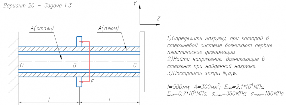1)Определить нагрузку, при которой в стержневой системе возникают первые пластические деформации. 2)Найти напряжения, возникающие в стержнях при найденной нагрузке. 3)Построить эпюры N,σ,w. l=500мм; A=300мм2/; E/ст=2,1*105/МПа; E/ал=0,7*105/МПа; σ/тст=360МПа; σ/тал=180МПа .