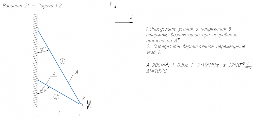 1.Определить усилия и напряжения в стержнях, возникающие при нагревании нижнего на ΔТ. 2. Определить вертикальное перемещение узла К. А=200мм2/; l=0,5м; E=2*105/МПа; α=12*10-6/1/град ΔT=100°С .