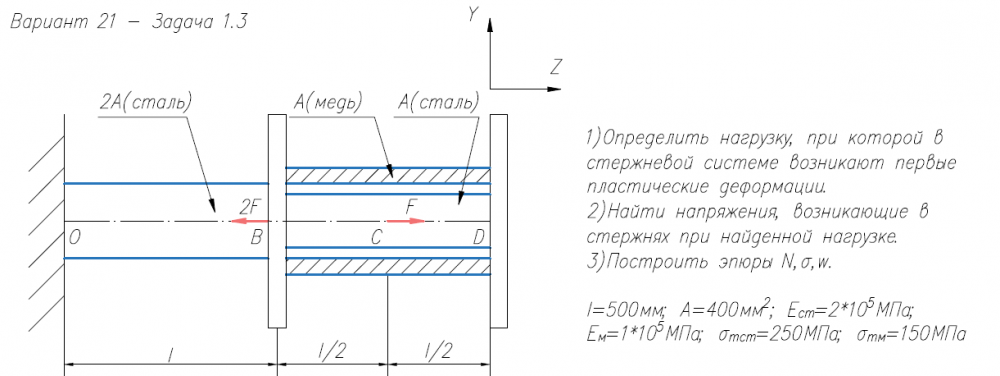 1)Определить нагрузку, при которой в стержневой системе возникают первые пластические деформации. 2)Найти напряжения, возникающие в стержнях при найденной нагрузке. 3)Построить эпюры N,σ,w. l=500мм; A=400мм2/; E/ст=2*105/МПа; E/м=1*105/МПа; σ/тст=250МПа; σ/тм=150МПа .