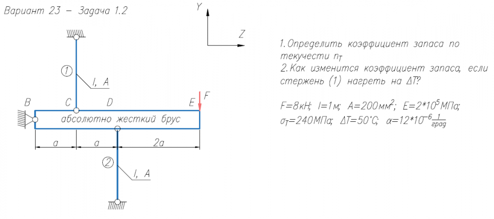 1.Определить коэффициент запаса по текучести n/Т 2.Как изменится коэффициент запаса, если стержень (1) нагреть на ΔТ? F=8кН; l=1м; A=200мм2/; E=2*105/МПа; σ/Т=240МПа; ΔT=50°С; α=12*10-6/1/град .
