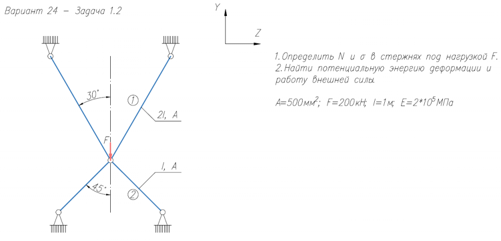 1.Определить N и σ в стержнях под нагрузкой F. 2.Найти потенциальную энергию деформации и работу внешней силы. А=500мм2/; F=200кН; l=1м; E=2*105/МПа.