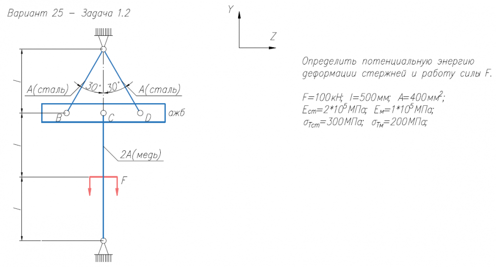 Определить потенциальную энергию деформации стержней и работу силы F. F=100кН; l=500мм; А=400мм2/; E/ст=2*105/МПа; E/м=1*105/МПа; σ/Тст=300МПа; σ/Тм=200МПа;.