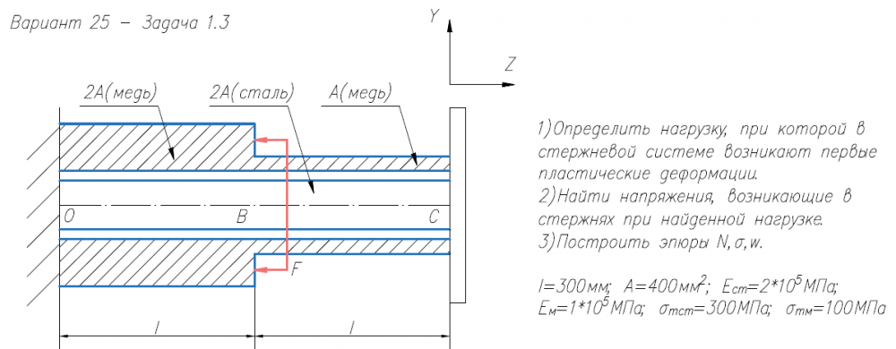 1)Определить нагрузку, при которой в стержневой системе возникают первые пластические деформации. 2)Найти напряжения, возникающие в стержнях при найденной нагрузке. 3)Построить эпюры N,σ,w. l=300мм; A=400мм2/; E/ст=2*105/МПа; E/м=1*105/МПа; σ/тст=300МПа; σ/тм=100МПа.