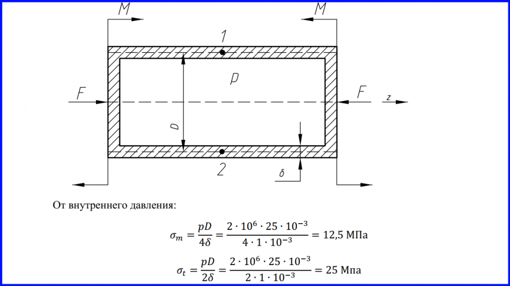 Тонкостенная замкнутая трубка подвергается действию внутреннего давления Р и сил F, представленных на схеме Изучить напряжё нное состояние трубки в области, достаточно удалённой от её концов..
