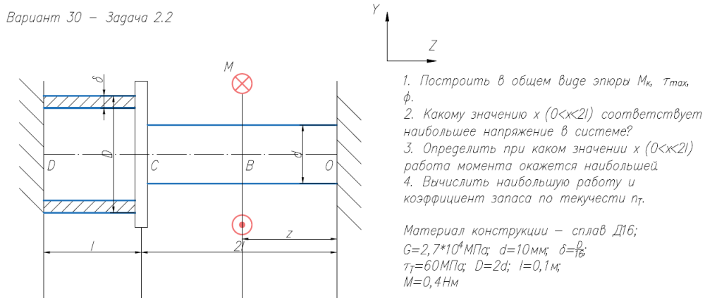 1. Построить в общем виде эпюры М/к, τ/max, φ. 2. Какому значению х (0<х<2l) соответствует наибольшее напряжение в системе? 3. Определить при каком значении х (0<х<2l) работа момента окажется наибольшей. 4. Вычислить наибольшую работу и коэффициент запаса по текучести n/Т. Материал конструкции - сплав Д16; G=2,7*104/МПа; d=10мм; δ=D/16; τ/Т=60МПа; D=2d; l=0,1м; M=0,4Нм.