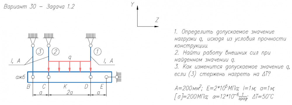 1. Определить допускаемое значение нагрузки q, исходя из условия прочности конструкции. 2. Найти работу внешних сил при найденном значении q. 3. Как изменится допускаемое значение q, если (3) стержень нагреть на ΔT? A=200мм2/; E=2*105/МПа; l=1м; a=1м; [σ]=200МПа; α=12*10-6/1/град; ΔT=50°С.