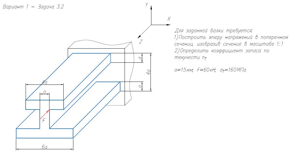 Для заданной балки требуется: 1. Построить эпюру напряжений в поперечном сечении, изобразив сечение в масштабе 1:1; 2. Определить коэффициент запаса по текучести nт. Параметры задачи: a = 15мм, F = 60кН, т = 160МПа..