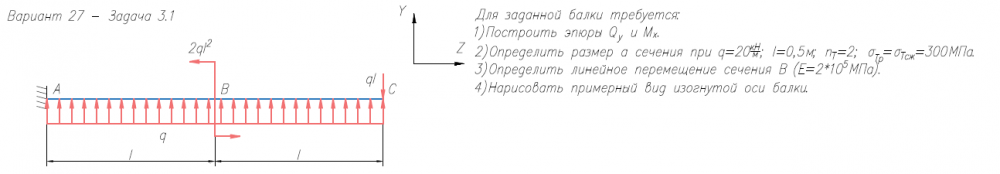 1. Построить эпюры Qy и Mx; 2. Определить коэффициент запаса конструкции nт при q = 20Н/мм, l = 1000мм, тр = тсж = 300МПа; 3. Определить линейное перемещение сечения C, vC (E = 2 · 105МПа); 4. Нарисовать примерный вид изогнутой оси балки..