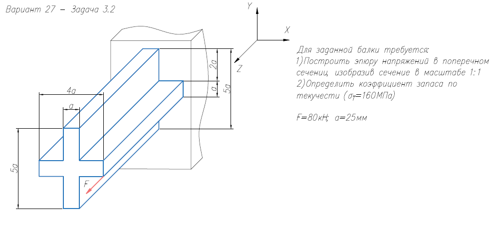 Для заданной балки требуется: 1. Построить эпюру напряжений в поперечном сечении, изобразив сечение в масштабе 1:1; 2. Определить коэффициент запаса по текучести nт. Параметры задачи: a = 15мм, F = 60кН, т = 160МПа..