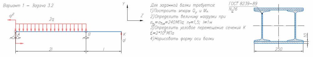 Задача 2 (прямой изгиб) Для заданной балки требуется: 1) Построить эпюры Qy и Mx; 2) Нарисовать форму изогнутой оси балки; 3) Определить величину нагрузки при σтр = σтс = 240 МПа, nт = 1.5, l = 1м; 4) Определить угловое перемещение сечения К (при Е = 2х105 МПа) (методом Коши-Крылова и способом Верещагина)..
