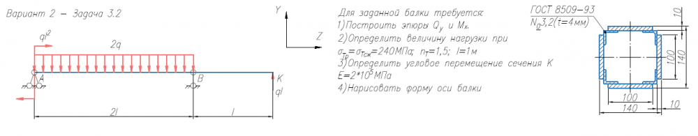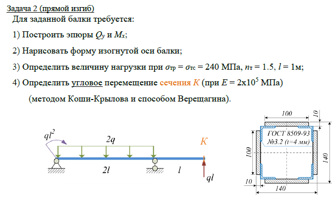 Задача 2 (прямой изгиб) Для заданной балки требуется: 1) Построить эпюры Qy и Mx; 2) Нарисовать форму изогнутой оси балки; 3) Определить величину нагрузки при σтр = σтс = 240 МПа, nт = 1.5, l = 1м; 4) Определить угловое перемещение сечения К (при Е = 2х105 МПа) (методом Коши-Крылова и способом Верещагина). .
