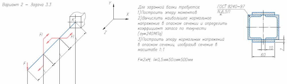 Задача 3 (косой изгиб / внецентренное растяжение-сжатие) Для заданной балки требуется: 1) Построить эпюру моментов; 2) вычислить наибольшее нормальное напряжение в опасном сечении и определить коэффициент запаса по текучести (σт = 240 МПа); 3) построить эпюру нормальных напряжений, изобразив сечение в масштабе. Размеры двутавров ⎯ по ГОСТ 8239-89, размеры швеллеров ⎯ по ГОСТ 8240-97 (серия «П» с параллельными гранями полок).