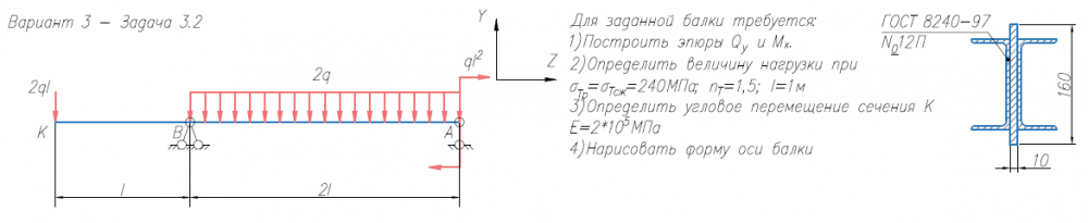 Задача 2 (прямой изгиб) Для заданной балки требуется: 1) Построить эпюры Qy и Mx; 2) Нарисовать форму изогнутой оси балки; 3) Определить величину нагрузки при σтр = σтс = 240 МПа, nт = 1.5, l = 1м; 4) Определить угловое перемещение сечения К (при Е = 2х105 МПа) (методом Коши-Крылова и способом Верещагина). .