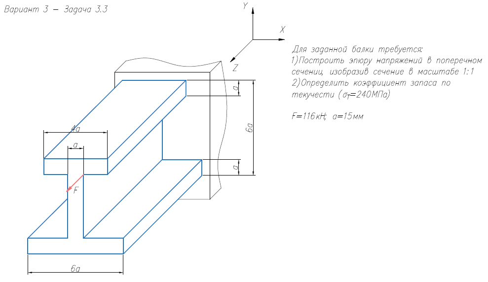 Задача 3 (косой изгиб / внецентренное растяжение-сжатие) Для заданной балки требуется: 1) Построить эпюру нормальных напряжений в поперечном сечении, изобразив сечение в масштабе; 2) Определить коэффициент запаса по текучести (σт = 240 МПа)..
