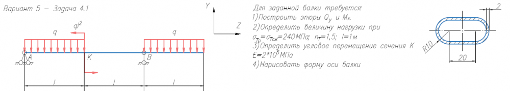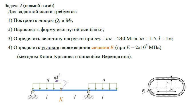 Задача 2 (прямой изгиб) Для заданной балки требуется: 1) Построить эпюры Qy и Mx; 2) Нарисовать форму изогнутой оси балки; 3) Определить величину нагрузки при σтр = σтс = 240 МПа, nт = 1.5, l = 1м; 4) Определить угловое перемещение сечения К (при Е = 2х105 МПа) (методом Коши-Крылова и способом Верещагина). .