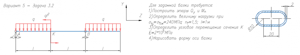 Задача 2 (прямой изгиб) Для заданной балки требуется: 1) Построить эпюры Qy и Mx; 2) Нарисовать форму изогнутой оси балки; 3) Определить величину нагрузки при σтр = σтс = 240 МПа, nт = 1.5, l = 1м; 4) Определить угловое перемещение сечения К (при Е = 2х105 МПа) (методом Коши-Крылова и способом Верещагина)..