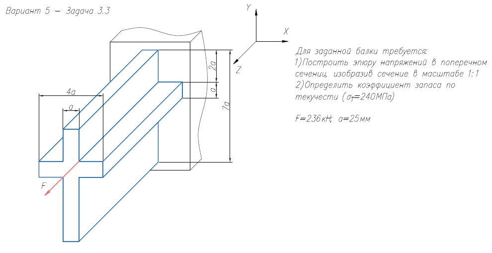 Задача 3 (косой изгиб / внецентренное растяжение-сжатие) Для заданной балки требуется: 1) Построить эпюру нормальных напряжений в поперечном сечении, изобразив сечение в масштабе; 2) Определить коэффициент запаса по текучести (σт = 240 МПа)..