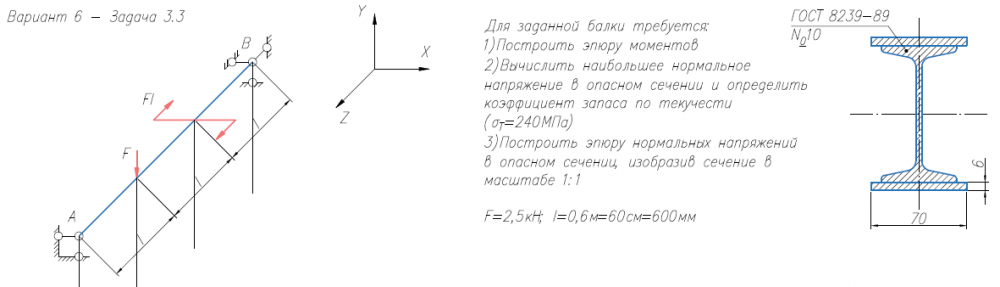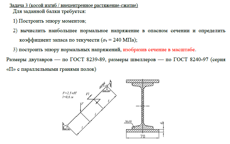 Задача 3 (косой изгиб / внецентренное растяжение-сжатие) Для заданной балки требуется: 1) Построить эпюру моментов; 2) вычислить наибольшее нормальное напряжение в опасном сечении и определить коэффициент запаса по текучести (σт = 240 МПа); 3) построить эпюру нормальных напряжений, изобразив сечение в масштабе. Размеры двутавров ⎯ по ГОСТ 8239-89, размеры швеллеров ⎯ по ГОСТ 8240-97 (серия «П» с параллельными гранями полок).