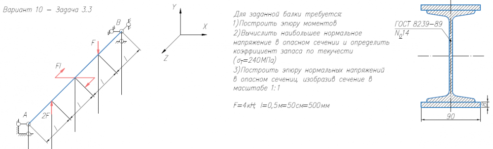 Задача 3 (косой изгиб / внецентренное растяжение-сжатие) Для заданной балки требуется: 1) Построить эпюру моментов; 2) вычислить наибольшее нормальное напряжение в опасном сечении и определить коэффициент запаса по текучести (σт = 240 МПа); 3) построить эпюру нормальных напряжений, изобразив сечение в масштабе. Размеры двутавров ⎯ по ГОСТ 8239-89, размеры швеллеров ⎯ по ГОСТ 8240-97 (серия «П» с параллельными гранями полок).