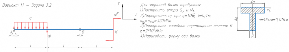 Задача 2 (прямой изгиб) Для заданной балки требуется: 1) Построить эпюры Qy и Mx; 2) Нарисовать форму изогнутой оси балки; 3) Определить nт при σтр = σтс = 320 МПа, q = 10 кН/м, l = 0.4 м; 4) Определить линейное перемещение сечения К (при Е = 2х105 МПа) (методом Коши-Крылова и способом Верещагина)..