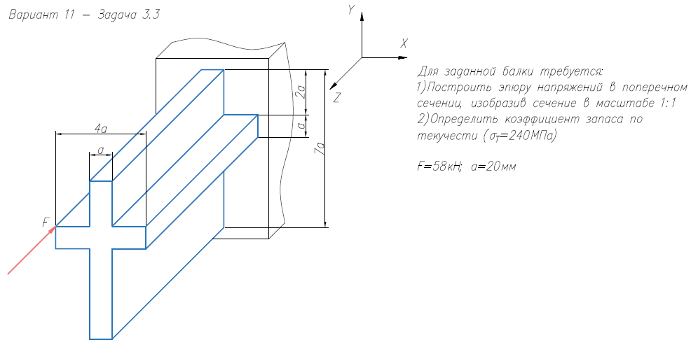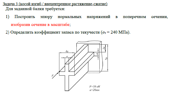 Задача 3 (косой изгиб / внецентренное растяжение-сжатие) Для заданной балки требуется: 1) Построить эпюру нормальных напряжений в поперечном сечении, изобразив сечение в масштабе; 2) Определить коэффициент запаса по текучести (σт = 240 МПа)..