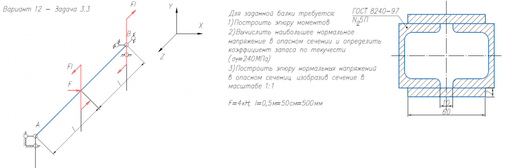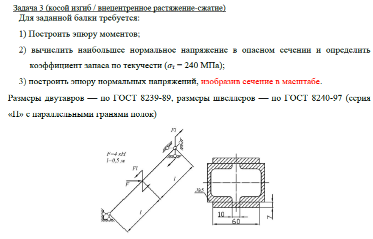 Задача 3 (косой изгиб / внецентренное растяжение-сжатие) Для заданной балки требуется: 1) Построить эпюру моментов; 2) вычислить наибольшее нормальное напряжение в опасном сечении и определить коэффициент запаса по текучести (σт = 240 МПа); 3) построить эпюру нормальных напряжений, изобразив сечение в масштабе. Размеры двутавров ⎯ по ГОСТ 8239-89, размеры швеллеров ⎯ по ГОСТ 8240-97 (серия «П» с параллельными гранями полок).