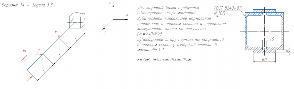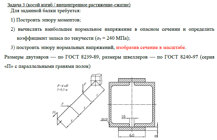 Задача 3 (косой изгиб / внецентренное растяжение-сжатие) Для заданной балки требуется: 1) Построить эпюру моментов; 2) вычислить наибольшее нормальное напряжение в опасном сечении и определить коэффициент запаса по текучести (σт = 240 МПа); 3) построить эпюру нормальных напряжений, изобразив сечение в масштабе. Размеры двутавров ⎯ по ГОСТ 8239-89, размеры швеллеров ⎯ по ГОСТ 8240-97 (серия «П» с параллельными гранями полок).