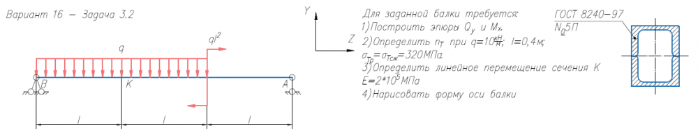 Задача 2 (прямой изгиб) Для заданной балки требуется: 1) Построить эпюры Qy и Mx; 2) Нарисовать форму изогнутой оси балки; 3) Определить nт при σтр = σтс = 320 МПа, q = 10 кН/м, l = 0.4 м; 4) Определить линейное перемещение сечения К (при Е = 2х105 МПа) (методом Коши-Крылова и способом Верещагина)..