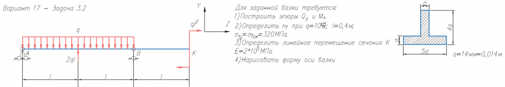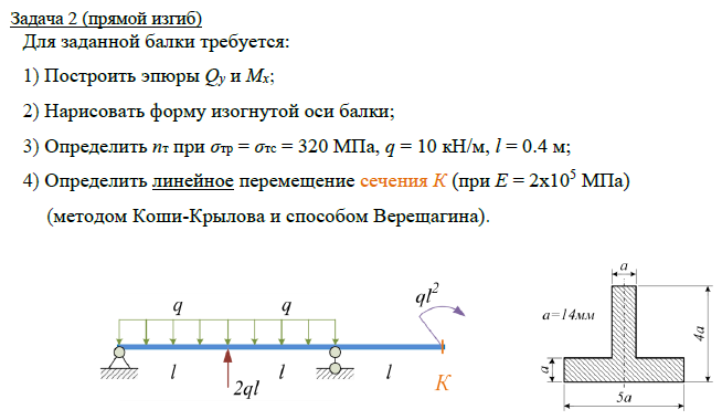 Задача 2 (прямой изгиб) Для заданной балки требуется: 1) Построить эпюры Qy и Mx; 2) Нарисовать форму изогнутой оси балки; 3) Определить nт при σтр = σтс = 320 МПа, q = 10 кН/м, l = 0.4 м; 4) Определить линейное перемещение сечения К (при Е = 2х105 МПа) (методом Коши-Крылова и способом Верещагина)..