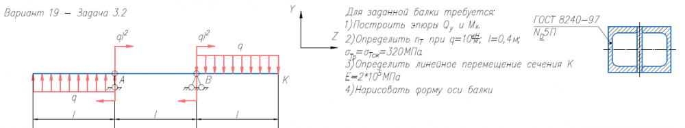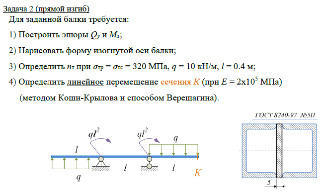 Задача 2 (прямой изгиб) Для заданной балки требуется: 1) Построить эпюры Qy и Mx; 2) Нарисовать форму изогнутой оси балки; 3) Определить nт при σтр = σтс = 320 МПа, q = 10 кН/м, l = 0.4 м; 4) Определить линейное перемещение сечения К (при Е = 2х105 МПа) (методом Коши-Крылова и способом Верещагина)..